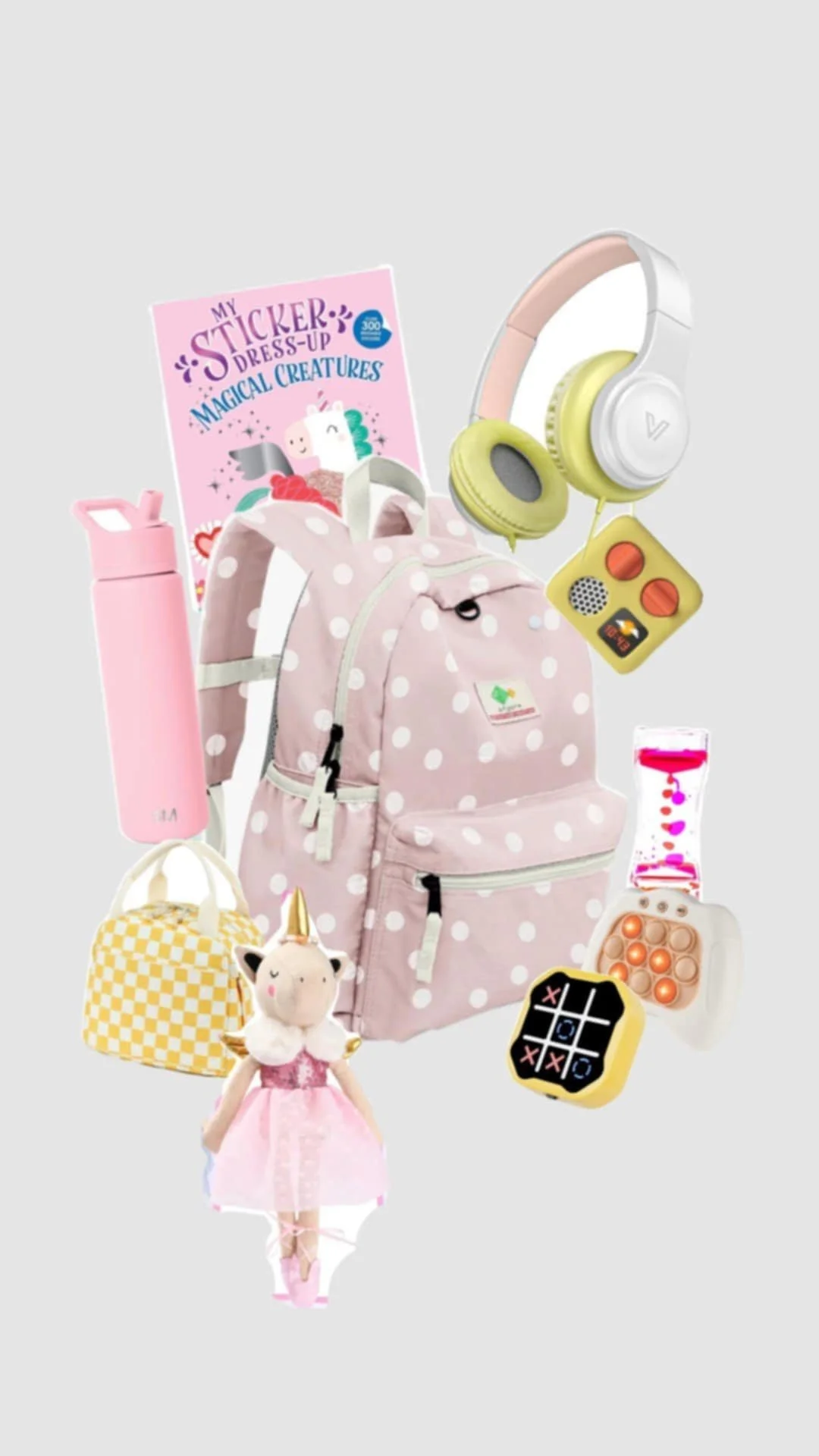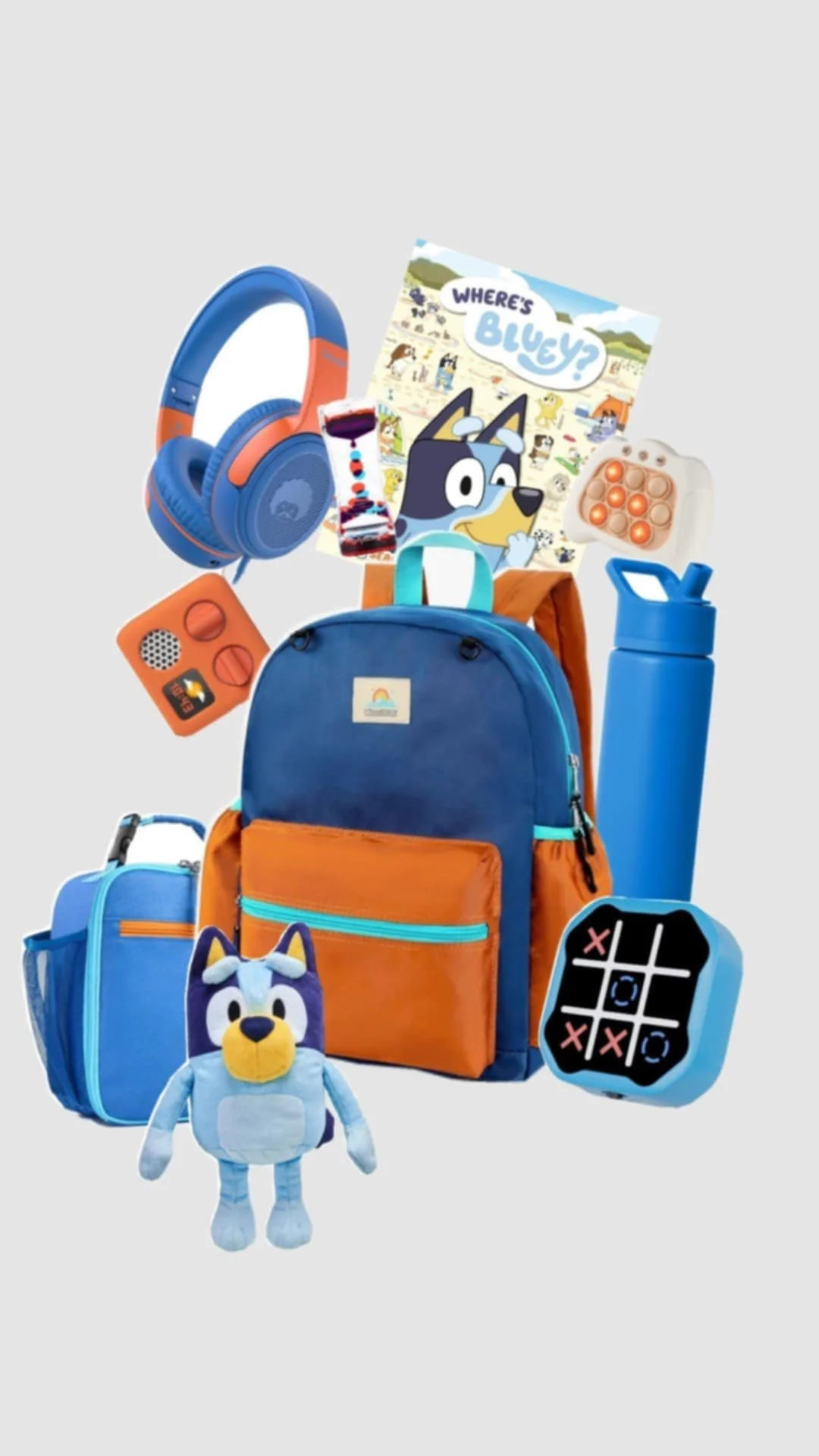 Chosen purely for the cheerful color combo, this set is perfect for little Bluey fans. It includes a blue and orange backpack, an orange sensory timer, a cuddly Bluey stuffed animal, and a Bluey sticker book for hands-on fun.