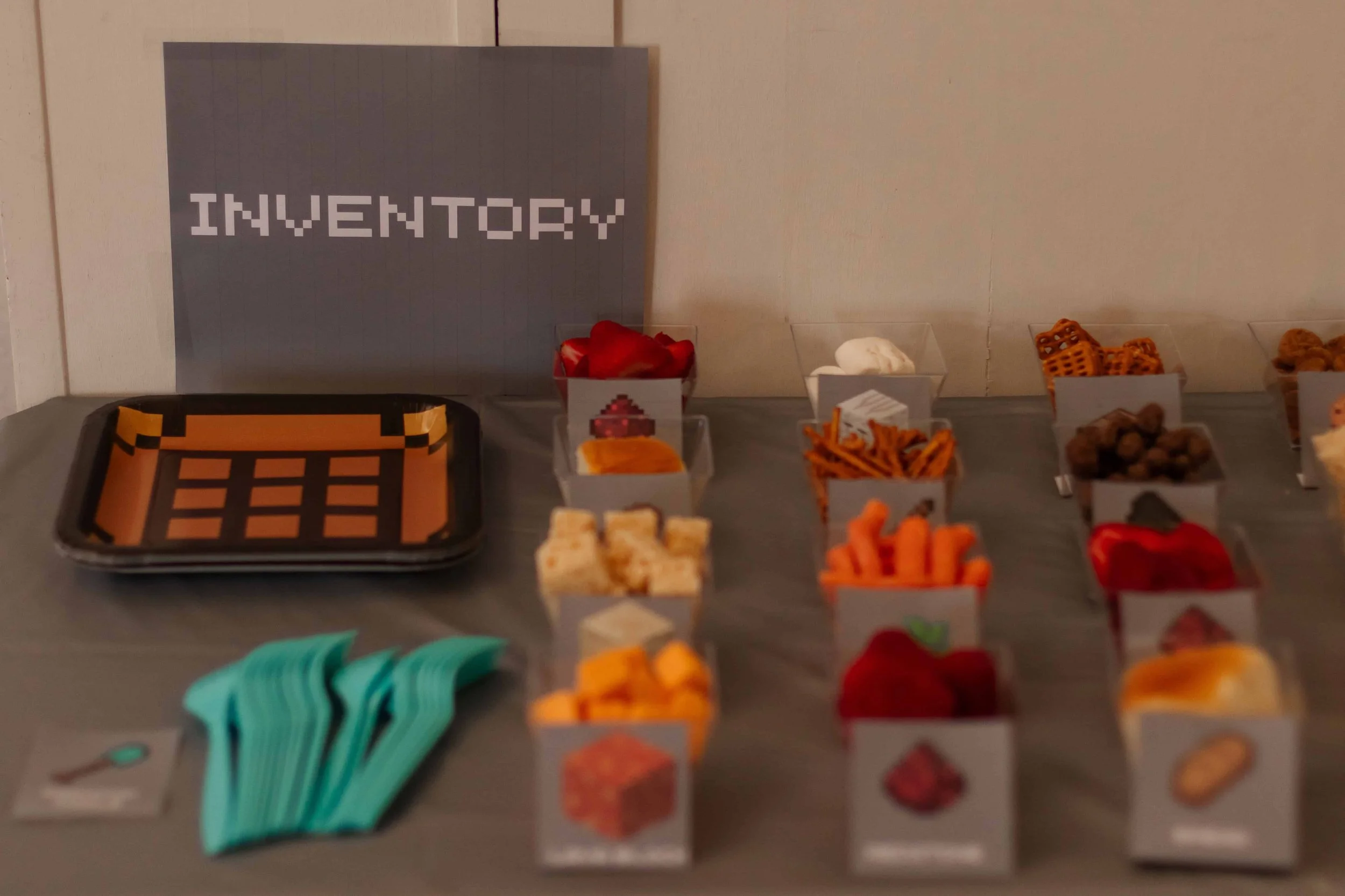 There were so many fun ideas on Pinterest that we were excited to do, but one thing I didn't see was an inventory-styled snack table, so that was my main focus for this party, and I'm really happy with how that turned out.